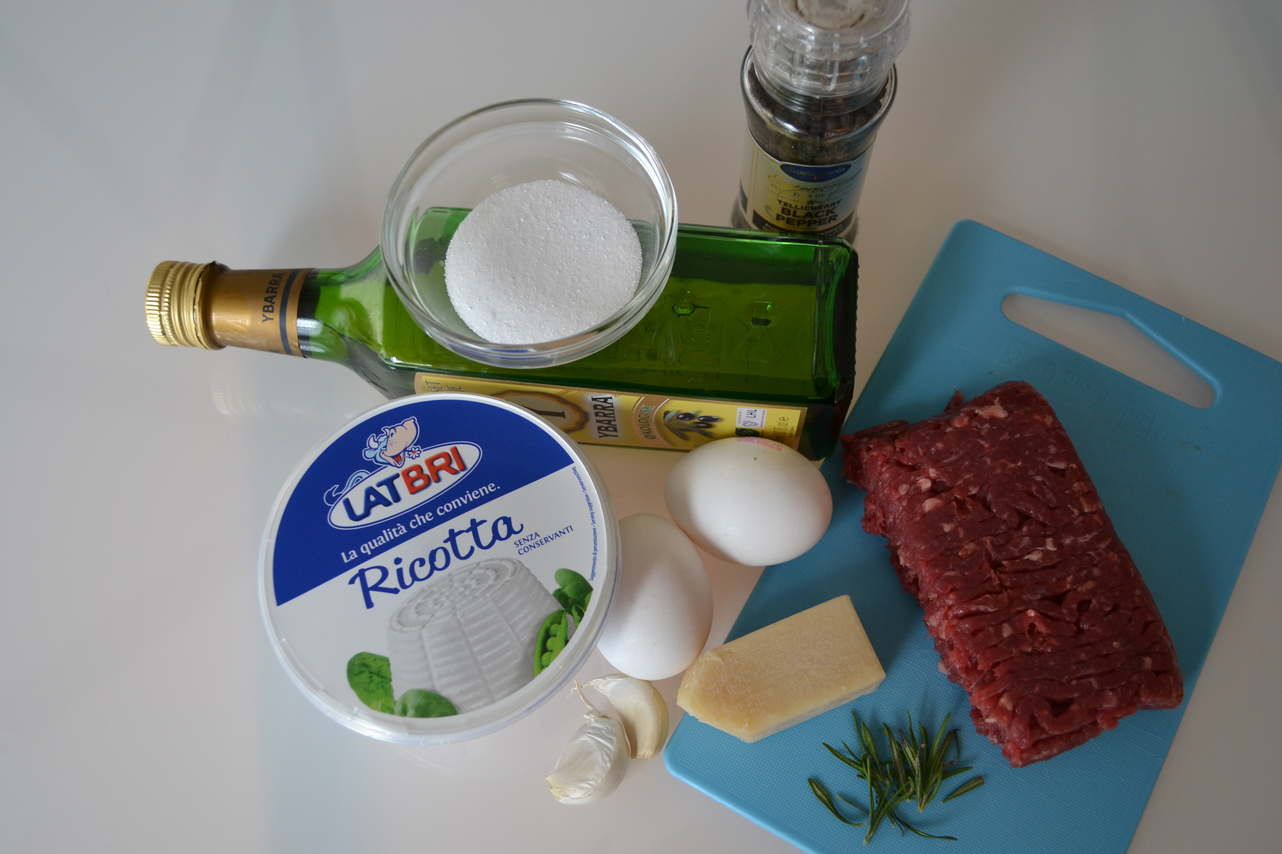 1 tablespoon olive oil, 2 garlic cloves, finely cut, 200 grams of minced meat (karbonadedeig), 2.5 deciliter of Ricotta cheese, 0.6 deciliter Parmesan, finely grated, 1 egg yolk, 0.6 deciliter basil leaves, finely cut, (I had some fresh rosemary instead), salt and pepper for you taste.