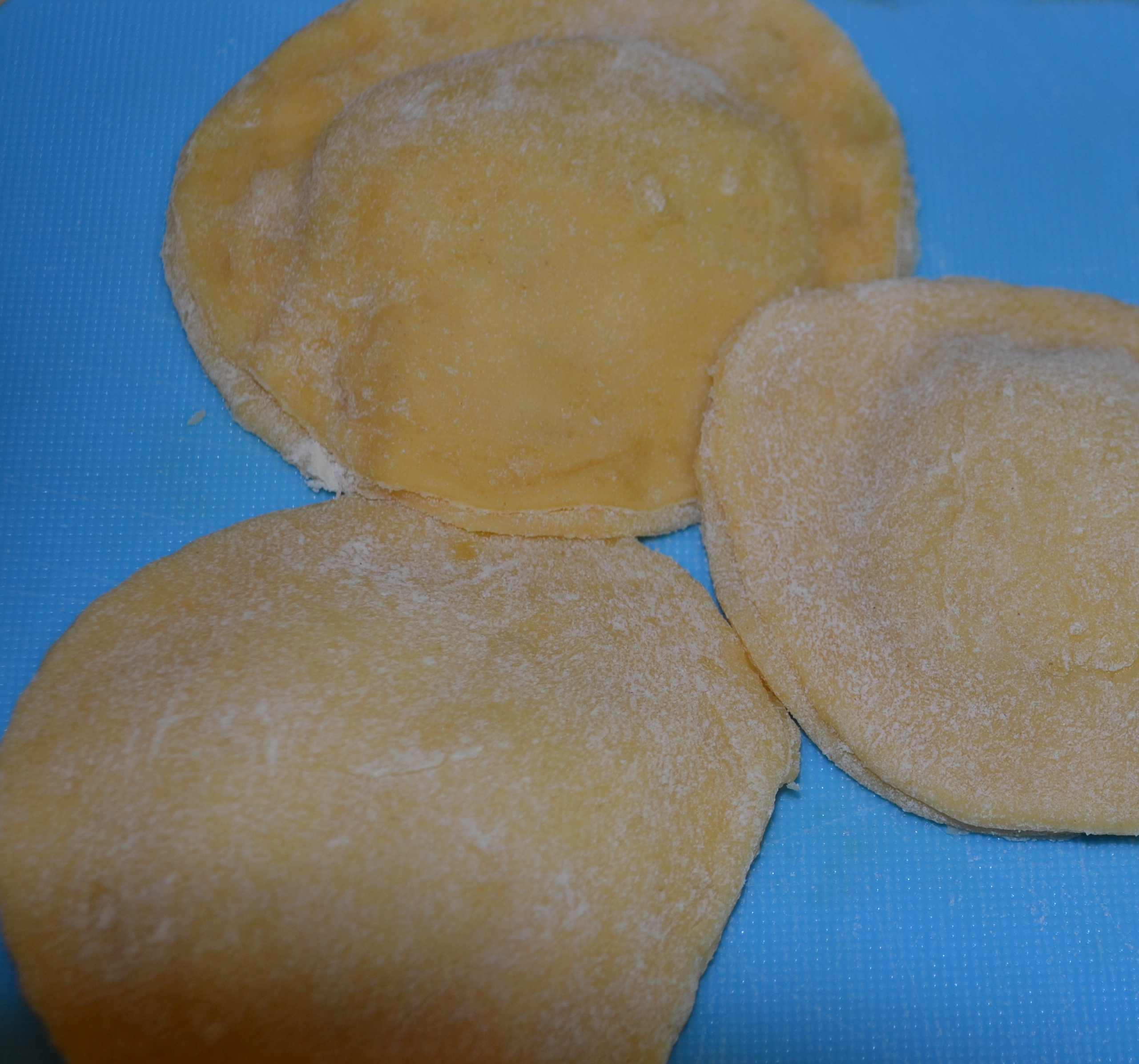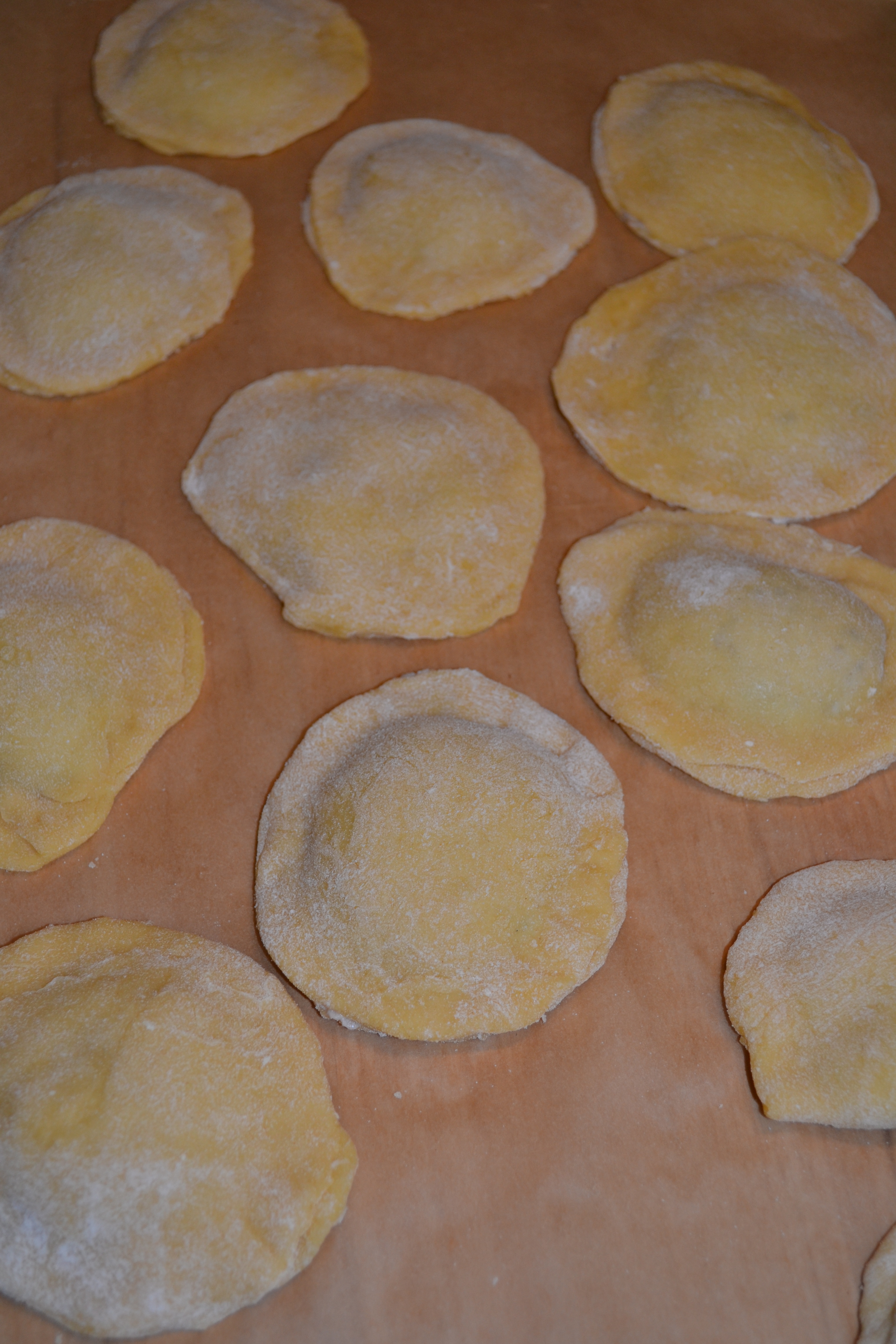 You then make a pasta dough, the receipt I used on the 9. July blog, and let it rest half an hour or so. Take your rolling pin and try to make the dough as thin as possible. Take something that cuts out circles and put a teaspoon of the meat mix on one circle and add a another one on the top to cover the meat. Use your fingers to make the circles stick together, like the picture below. Boil lots of water, add salt and boil it for 4-5 minutes, or till they are ready. Since it is eggs in the meat mix, be sure that it is cooked.